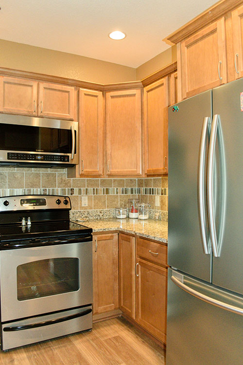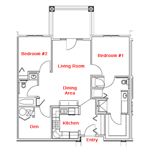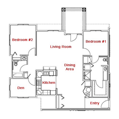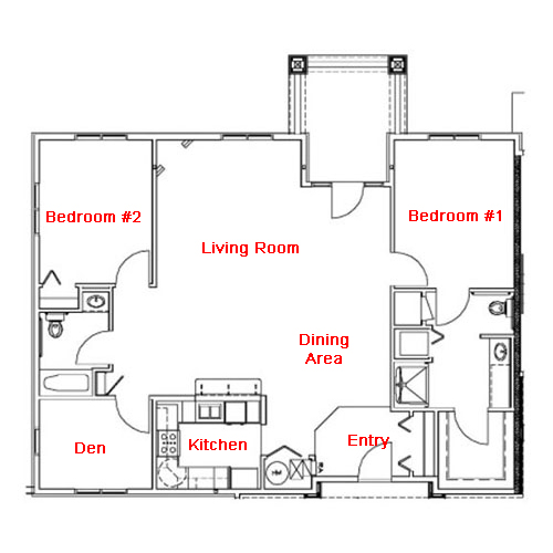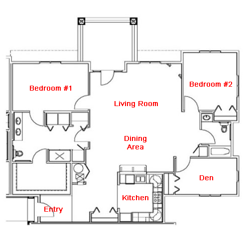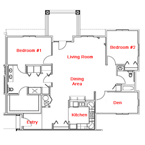 There are a variety of layouts. There are 1 bedroom and 1 bath condominiums of 778 square feet; 2 bedroom and 2 bath condominiums of 1,028 square feet; 2 bedroom, 2 bath plus den condominiums of 1,358 square feet; and larger corner units of 1,496, 1,638, 1,800, and 1,870 square feet.
